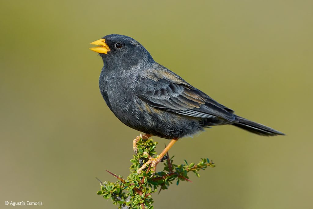 The Carbonated Sierra Finch is a small, robust songbird native to the open landscapes of Patagonia. Males are easily recognized by their dark, sooty-black plumage, while females are more subdued in color, with brownish tones. This species is adapted to harsh, windy environments and is often seen foraging on the ground or perched atop low shrubs. Its song is a simple, melodious series of notes, often heard during the breeding season. The Carbonated Sierra Finch is a member of the tanager family, though it resembles finches in both appearance and behavior. It is a year-round resident in its range and is considered an important part of the Patagonian avifauna.