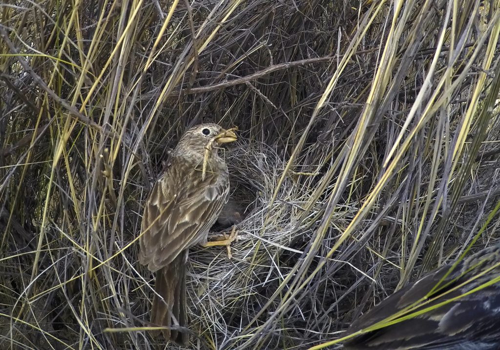 Feeds mainly on seeds and small insects, foraging on the ground or among low vegetation.